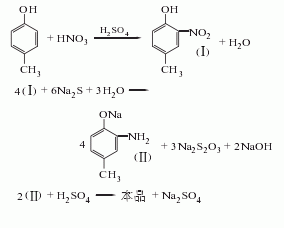 鄰硝基對酚用硫化堿或催化加氫還原而得。從對酚硝化出發(fā)原料消耗定額:對酚工業(yè)品963kg/t、硝酸(96%)661kg/t、(92.5%)2127kg/t、硫化堿(60%)2425kg/t、純堿20kg/t。